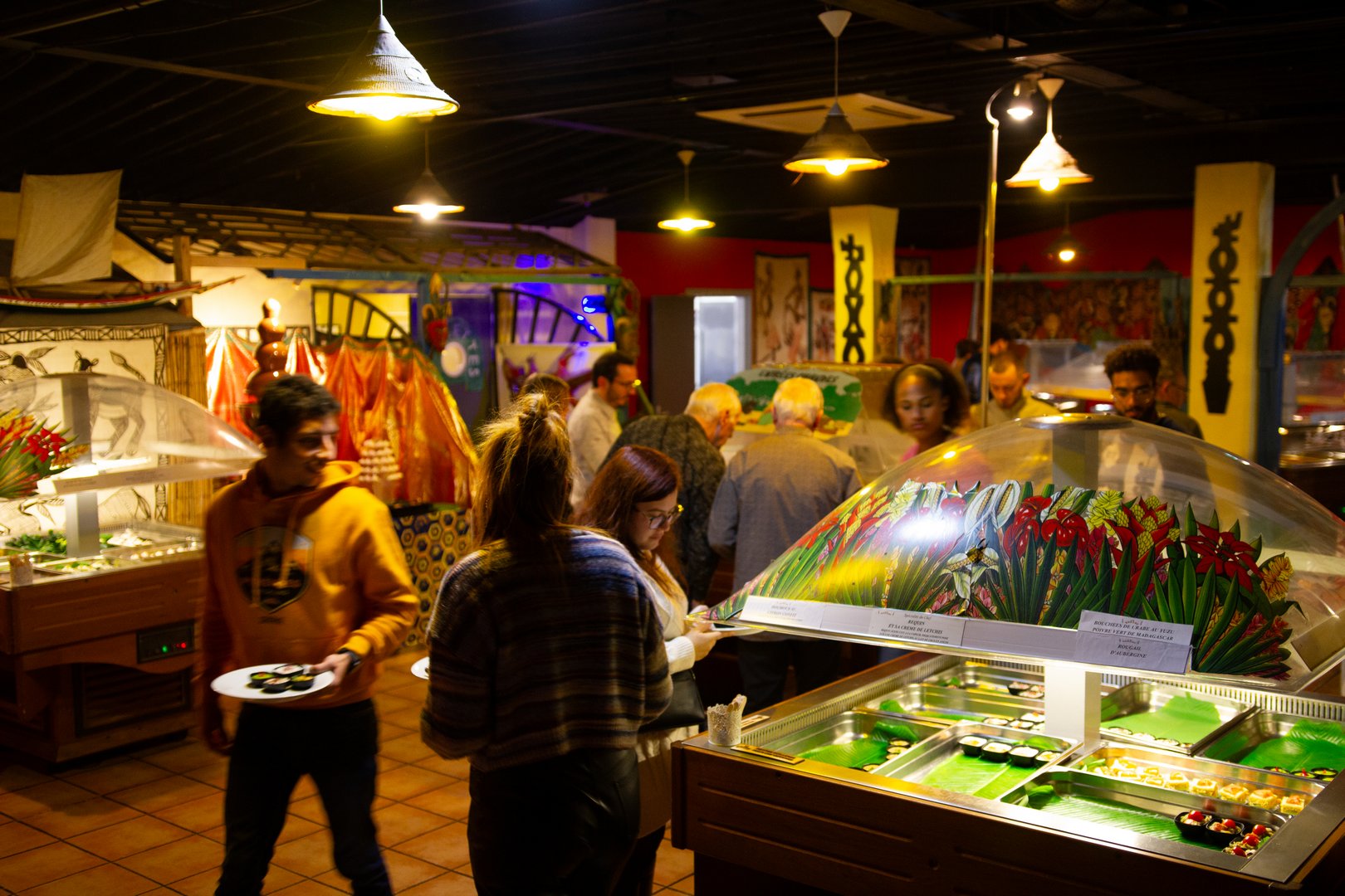 Le voyage débute avec des niama niama et se poursuit à travers un formidable choix de plats savoureux, à volonté, une diversité remarquable : malgaches, tahitiennes, réunionnaises, ivoiriennes, mauriciennes, indiennes... Chaque spécialité est une invitation au voyage, les saveurs restent en bouche et permettent de déguster pleinement chaque plat.